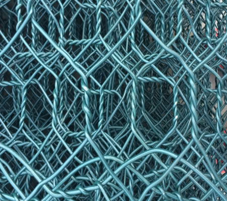 石籠網護墊分表面金屬鍍層和表面 PVC/PE涂層兩個大類。使用的金屬線徑是根據六角形的大小而不同。生產過程是經織網,剪切,鎖邊,綁扎后制成石籠和護墊。石籠和護墊以折疊狀態供貨。