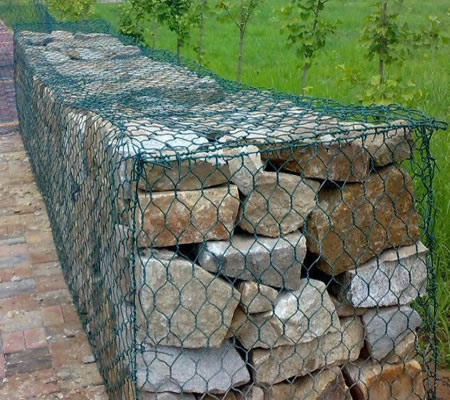 包塑石籠網是使用機器將金屬線材單向搓捻兩周編織的六角形網(六角網) 制成的網箱,厚度在0.15-0.5m(含0.5m),又稱石籠和護墊,石籠網墊由隔板分成若干單元格,為了加強石籠網墊結構的強度,所有的面板邊端均采用直徑更大的鋼絲。